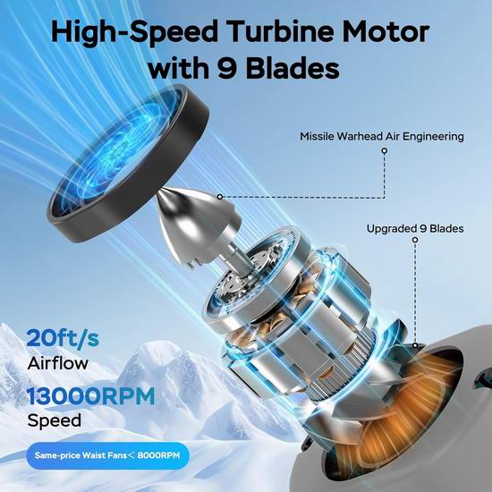 这款最新的免提腰带降温风扇采用高速涡轮马达和获得专利的导弹弹头形空气工程技术,拥有9片扇叶。以6100 至 13000 RPM的强劲转速旋转,4档风速调节,产生高达 20 英尺/秒的气流,带来强劲的空气流动,并在几秒钟内带走汗水和热量,是夏季户外活动的必备之选。内置5000mAh可充电电池,即使在炎热天气也能提供一整天的舒适体验。支持3小时快速充电,内置USB-A应急电源输出端口和电量指示灯,可作为充电宝使用。
