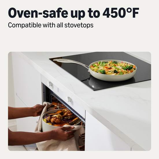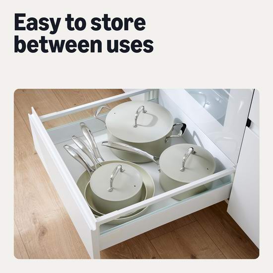 采用陶瓷不粘涂层,易于清洗,可耐受高达450°F(232°C)烤箱温度,适用于包括电磁炉在内的所有炉灶。符合人体工学的设计,不锈钢铆接手柄提供更安全的烹饪体验,握感舒适牢固,且手柄始终保持凉爽。套装包含1.6升带盖汤锅、2.4升带盖汤锅、4.7升带盖汤锅、20.1厘米煎锅和25.9厘米煎锅。