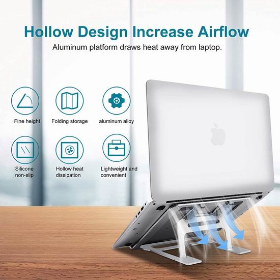此款支架采用轻型铝合金结构,经久耐用,便于携带,可快速打开和折叠,符合人体工学设计,调节笔记本电脑的观看角度,避免不当姿势造成的颈部手部疲劳和疼痛,并有助于笔记本散热。可用于放置10-15.8英寸笔记本电脑和平板电脑,5级角度调节,最大承重40磅。