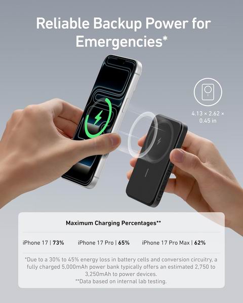采用MiniCell技术,机身更小更轻;约4.13×2.62×0.45英寸、重约4.41盎司,可吸附在手机背面并轻松放入口袋/包里。强磁力吸附,单手拿着也更稳;一贴合即可对准充电,减少无线充电错位断连。专为iPhone 12–17系列使用。随附60cm USB-C to USB-C线、说明书,并提供24个月质保与客服支持。