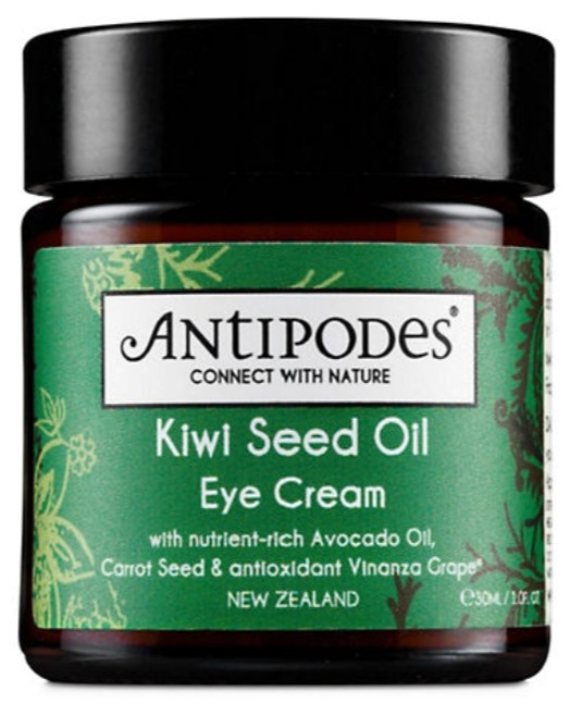 Antipodes Kiwi Seed Oil Eye Cream 奇异果籽油眼霜:最享有盛名的就是这款眼霜了,牛尔曾经推荐过,也获过时尚芭莎年度美妆大奖,大概搜Antipodes这个品牌显示结果最多的就是它了。主打保湿和黑眼圈淡化。核心成分是新西兰奇异果籽中的维他命C,特别修复受损眼部皮肤组织;另外一个核心成分就是纯度100%的鳄梨油(牛油果油),此外还含有芦荟凝胶,减少对眼部的刺激,可以促进人体自身胶原蛋白合成提高82%。