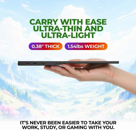 为您的笔记本电脑添加一个灵活的 15.6 英寸便携式第二屏幕,实现更流畅的多任务处理、更高的工作效率和更舒适的追剧体验。采用1920x1080 全高清面板,呈现清晰锐利的细节,是处理电子表格、视频通话、玩游戏和观看流媒体的理想之选。170°/170° IPS显示屏可从任何角度呈现精准色彩。您可以与队友分享屏幕、查看内容或欣赏媒体,而无需担心亮度或色彩一致性下降。专为移动办公而设计,可轻松放入您的包中,并配备优质智能保护套。配备双 USB-C 端口和 Mini HDMI 端口可与笔记本电脑、MacBook、PC、游戏机(PS5、Xbox、Switch)等多种设备兼容,设置快速轻松,无需驱动程序。