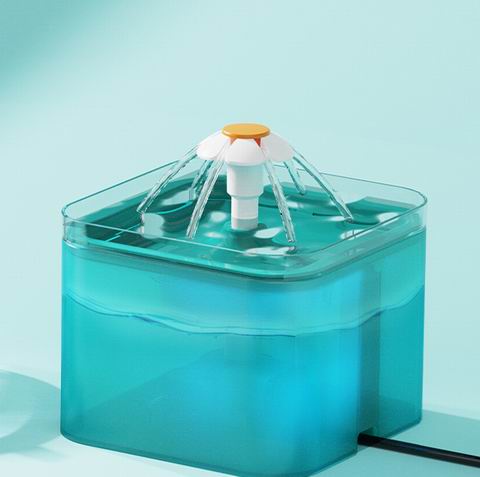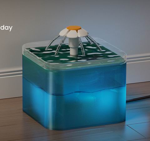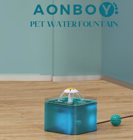 AONBOY宠物饮水器配备四重过滤系统(滤棉、椰壳活性炭、离子交换树脂)以净化水质,2L大容量水箱≤30dB超静音水泵适合中小型宠物使用,内置LED水位灯并提供花瀑布花泡泡柔和喷泉三种水流模式,兼顾长效供水与饮水趣味性。