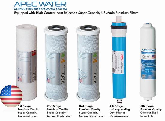 第5级:10 英寸精炼椰壳活性炭滤芯,为APEC专利技术生产的抛光型精炼椰壳活性炭滤芯,改善水的口感,使其更佳可口,甜美。