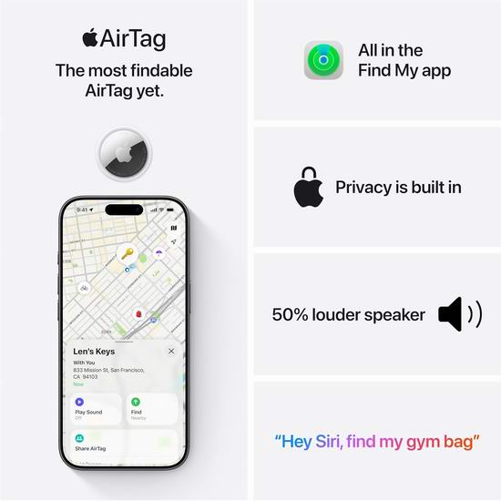 新款 AirTag 配备了与iPhone 17相同的第二代超宽带技术芯片,使之更加容易被定位。精确查找功能使用震动、视觉和音频反馈指引用户寻找遗失物品,查找范围相比前代扩大最高50%。同时,升级的蓝牙芯片扩展了物品可被定位的范围。用户可通过 Apple Watch Series 9 或后续表款使用精确查找功能寻找AirTag。新款AirTag的扬声器音量比前代提升50%,可让用户在比之前远最多1倍的距离听到 AirTag 的声音。结合增强的精确查找功能和极具辨识度的新鸣音,AirTag 可帮助用户更轻松地找到重要物品。