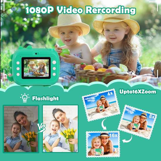 这款儿童即时打印相机简单易用,一键轻松切换打印、拍照和自拍模式,适合3-14岁的小朋友们成为小摄影师。套装内含美丽的丝带礼盒,7卷黑白打印纸(约350张打印),12支彩色笔和2张卡通贴纸。相机配备2.4英寸IPS护眼屏,支持1080P视频录制与回放,照片自选打印,4种不同打印密度和2种打印模式,包含多种有趣的照片边框、滤镜和拼图,还具备定时拍摄、连续拍摄、16倍变焦、循环拍摄、音乐播放等功能,让孩子们尽享拍照的乐趣和休闲时光。