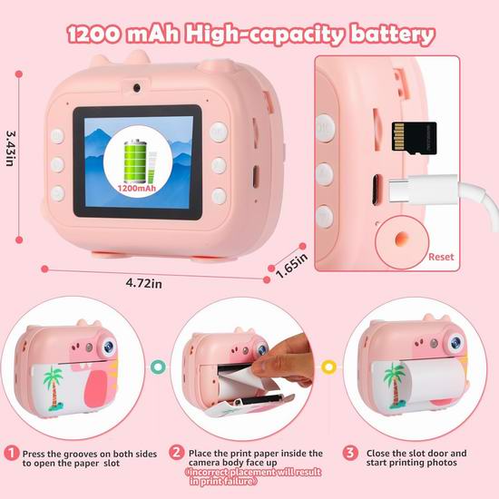 内置1200mAh可充电电池,充满电后相机可使用2-5小时。配有32GB内存卡,可存储数千张照片和视频。轻便的挂绳设计,方便随身携带。相机具有无操作自动关机和屏幕保护功能,支持智能过热保护功能,当因长时间操作导致设备加热至55℃时自动触发警报并暂停打印功能,确保孩子安全。