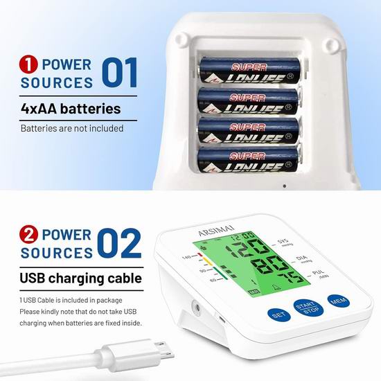 此款血压计配备3.5英寸高清易读LCD大屏幕,一键操作,全自动测量血压和心跳速率,测量数据准确稳定,可储存2人 x 99组数据,紧凑型设计,方便随身携带。支持4节AAA电池(不包含)和USB双电源供电,在使用电池供电时,不可用USB充电。