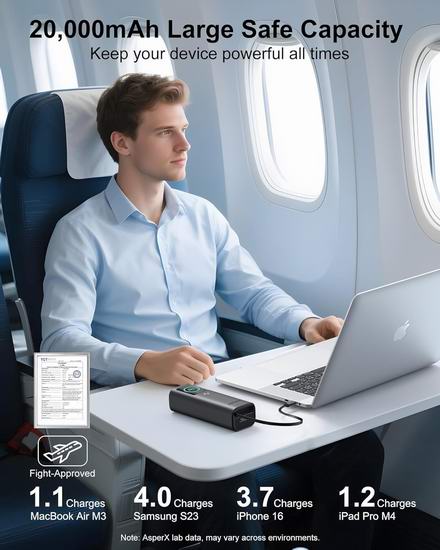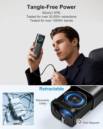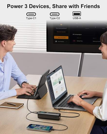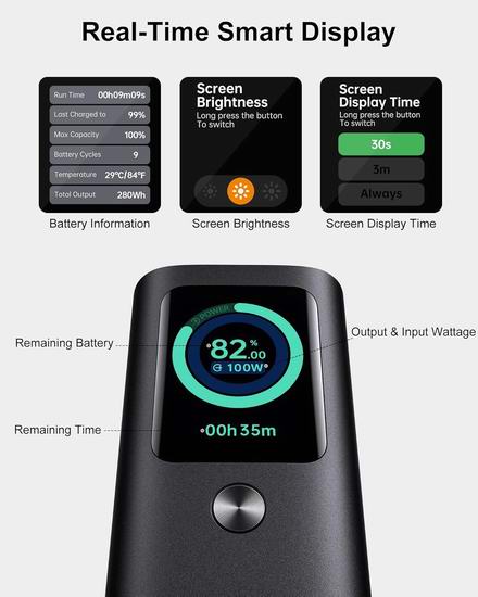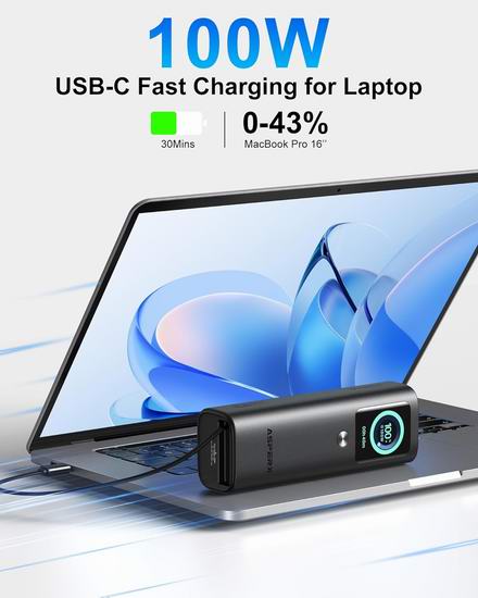 这款充电宝具有100W + 65W输出功率,可同时为笔记本电脑和手机充电,动力十足。使用 100W USB-C 端口,33 分钟即可为 16 英寸 MacBook Pro 充电至 50%。内置60厘米伸缩 USB-C 充电线,几秒钟即可为设备充电。内置USB-C 端口和 USB-A 端口,可同时为3台设备充电。搭载智能数字显示屏,可实时显示电池电量、剩余使用时间、输出/输入功率和电池信息。