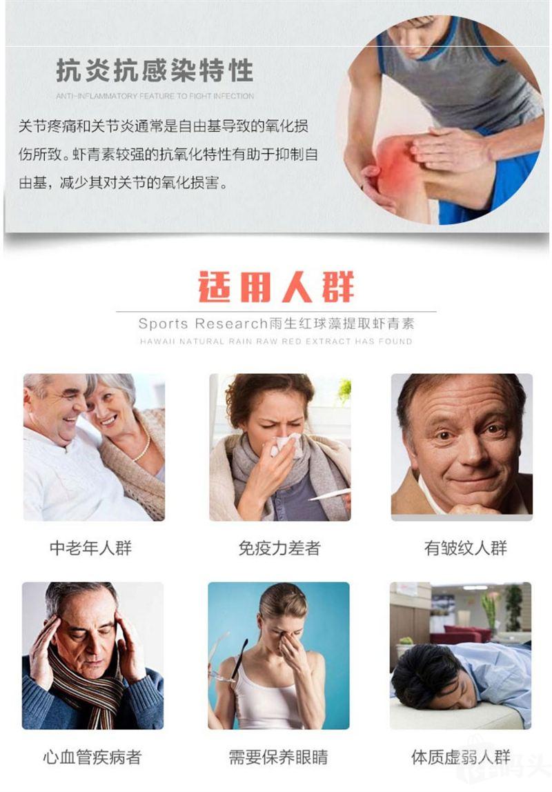 Sports Research 虾青素是一种通过非转基因验证、源自微藻类的抗氧化类胡萝卜素。研究表明虾青素可以维护皮肤(在日晒中)、眼睛健康以及健康的炎性反应。