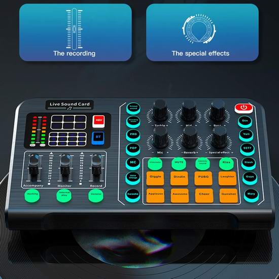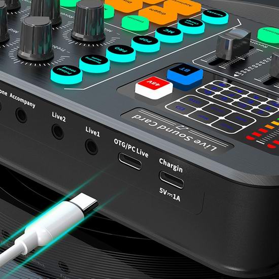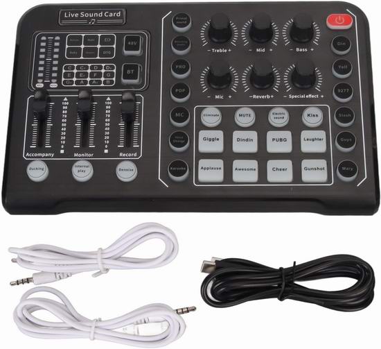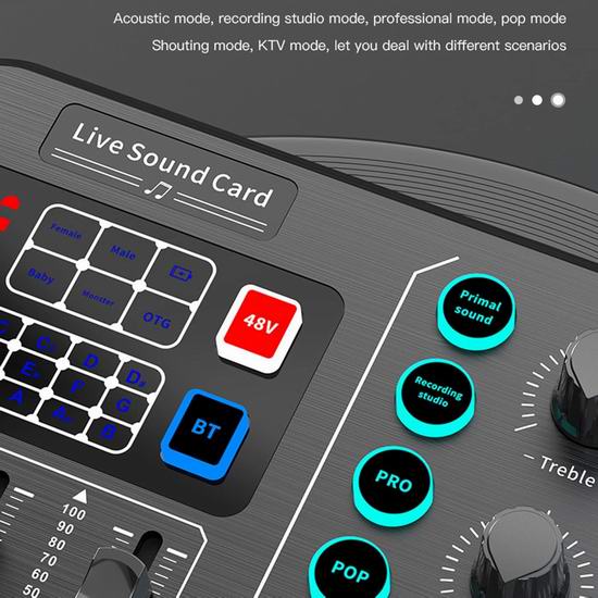 这款声卡混音器采用一键智能降噪技术,可有效过滤交流干扰,阻隔外部环境噪音,带来更清晰、更稳定、更纯净的声音。搭载智能处理芯片,可调节节奏,输出效果更佳,同时支持一键消除原声。拥有 15 种特效环境音效,全新的温暖环境音效,激活您的现场房间氛围,让您在现场演出中不再尴尬。支持99%的应用程序,兼容手机、电脑和平板电脑。可用于DJ、电容麦克风、在线卡拉OK、播客麦克风、唱歌、YouTube直播、吉他演奏等。设计小巧,便于携带。使用简单,只需将其连接到其他设备,声音就会随之改变。