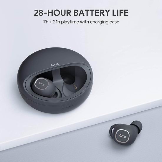 采用蓝牙V5.0技术,高保真音质,真正的无绳设计,IPX5防水,轻巧舒适,带给您完美的时尚无线音乐体验,两个人共享耳机也不再尴尬。内置麦克风,可免提接听电话,充电满电后,可通话或播放音乐7小时,耳机充电座内置锂电池,可为耳机补充电力,累计续航可达28小时。