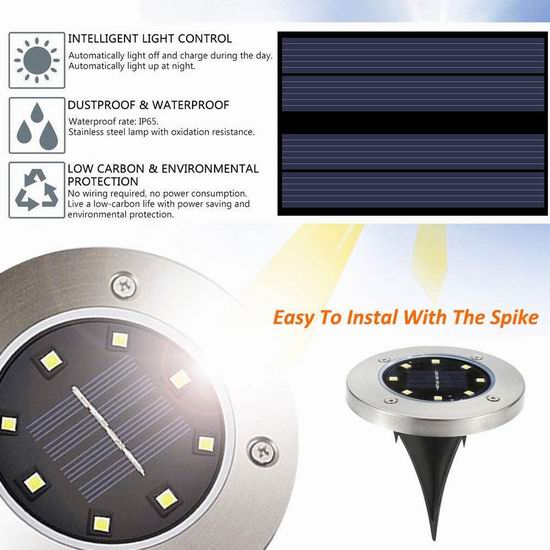 这款庭院照明灯采用IP65级防水PC塑料外壳,太阳能供电,无需布线,黄昏时自动亮起,充满电后夜间可持续照明8-10小时,适用于各种天气状况,可插入地面或花园里即可。