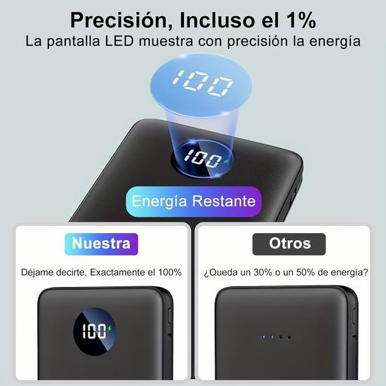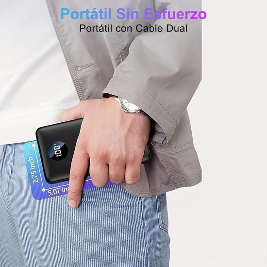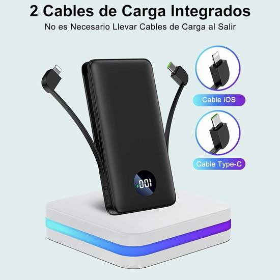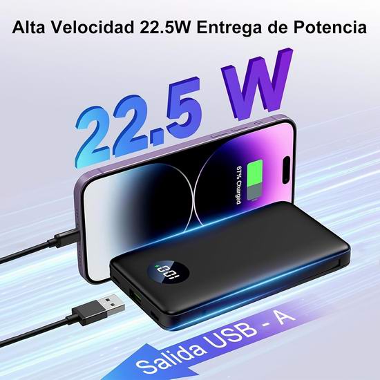 这款充电宝内置 Lightning 和 USB-C 充电线,配备1个 USB输出口,:支持高达 22.5W 的 PD3.0 和 QC3.0 快速充电,可在半小时内将手机电量从 0% 充至 50%,支持同时为3部手机充电。配备数字显示屏,显示剩余电量(0%至100%),低电量提醒功能会在需要充电时发出通知。