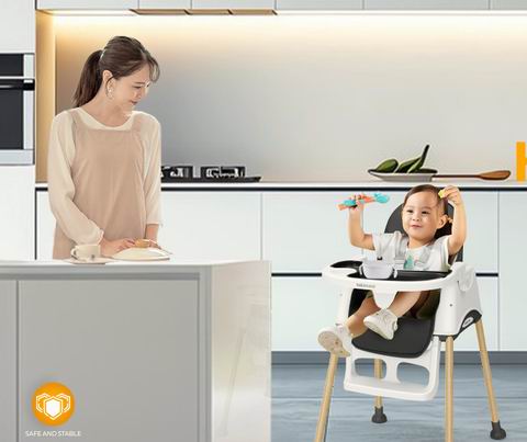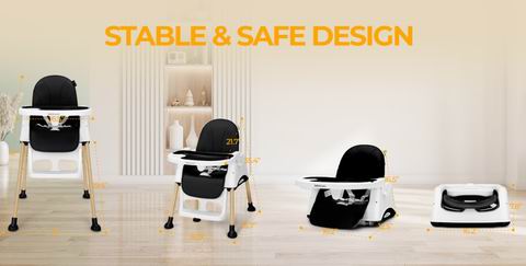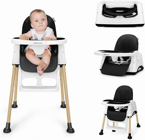 babimoni 三合一婴儿高脚椅(黑色)小巧多功能,可在高脚椅、矮脚椅与增高座椅三种模式间一键切换,轻松满足宝宝从辅食添加到日常喂养的成长需求;配备三档可调的双层可拆卸托盘,上层专注进食、下层用于玩耍与摆放物品,贴合不同阶段与场景使用;稳固钢管结构结合三角支撑设计,有效提升稳定性并降低倾倒风险,搭配可调节五点式安全带,守护宝宝坐姿安全;同时安装与拆卸便捷,收纳省空间,居家或出行携带都更方便;清洁也更省心,托盘可拆卸并支持洗碗机清洗,座椅垫湿布一擦即可,特别适合忙碌家庭。
