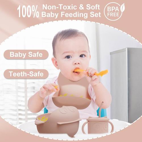 这款优质硅胶制成的婴儿餐具套装,不含BPS、BPA、PVC、邻苯二甲酸盐和铅,确保了婴幼儿的安全。柔软安全的硅胶材质有助于宝宝自行进食,不伤宝宝的牙齿,是断奶过程中的最佳选择。可爱的猫头鹰形状幼儿盘和碗套装带有吸力,可以牢固地粘在高脚椅上,不再担心宝宝挥手打翻食物;婴儿碗两侧凸起,方便宝宝舀食物,防止溢出。符合人体工程学设计的幼儿勺子、叉子和杯子手柄适合幼儿的小手握持,圆形边缘非常适合幼儿的嘴巴,带奶嘴盖的婴儿杯可帮助宝宝喝水,替换吸管盖供大一点的婴儿使用,还包括一个可更换的盖子。柔软婴儿围兜轻便防水,采用无划痕闭合和圆领设计,让婴儿保持舒适;硅胶围兜具有更深、更坚固的口袋,非常适合接住掉落的食物,保护衣服、地板和桌子免遭弄乱。颈带提供4种尺寸,最适合6个月至6岁儿童的第一阶段套装。易于清洁、冲洗和干燥,所有部件均可用于洗碗机、消毒锅、微波炉和冰箱。