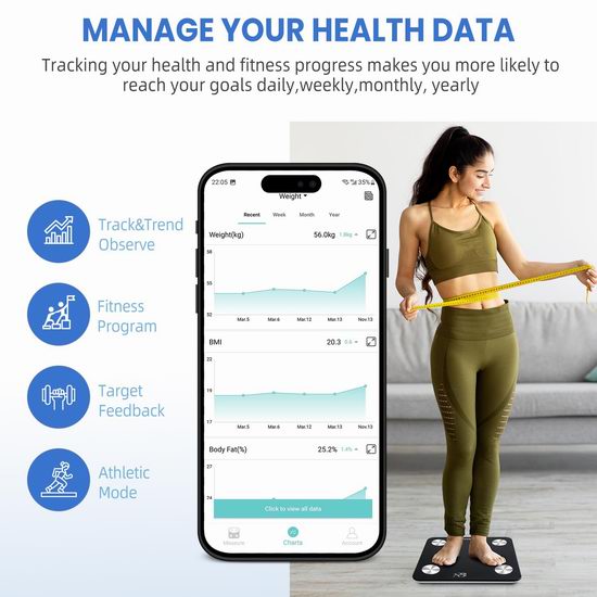 这款高精度智能体重秤,能帮助您全方位了解身体成分,测量 BMI、体脂、体内水分和骨量等指标,助您更好地掌控健康状况。配备4个高精度传感器,精度为0.2磅/0.05千克,最大承重为180千克/400磅。使用方便,只需站上秤即可自动启动,使用后自动关闭。通过与 Fitdays 应用程序配对,您可以追踪健康趋势、营养摄入和卡路里消耗,全面了解体重变化。智能秤配备11x11英寸的钢化玻璃台面,易于清洁,具备防滑和防倾倒设计。其FITDAYS应用还支持无限用户自动识别和注册,具有宝宝模式,适合全家使用。