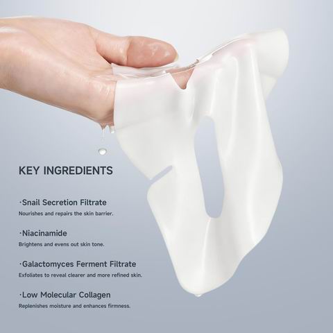 生物胶原蛋白蜗牛粘液亮采面膜(4片装)结合低分子生物胶原蛋白与蜗牛粘液的高效修护力,深层补水、提升弹性,令肌肤更紧致光滑。配方添加烟酰胺、益生菌与半乳糖酵母菌发酵物,可提亮肤色、细致毛孔、强化皮肤屏障,帮助锁住水分、提升柔软度。这款温和的夜间凝胶型面膜能让营养成分持续吸收,早晨醒来肌肤呈现清新透亮光泽。经敏感肌测试,适合所有肤质使用,给予肌肤稳定、舒缓、亮泽的全方位护理。