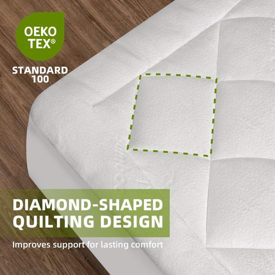 这款床垫罩通过OEKO-TEX STANDARD 100 认证,确保不含任何有害化学物质。床垫外层采用40%竹纤维和60%聚酯纤维混纺面料,内部填充仿羽绒超细纤维,兼具舒适性和耐用性,提供充足的支撑和柔软舒适的触感。菱形绗缝设计,确保填充物均匀分布,有效防止结块或移位。凭借其360度弹性和深口袋设计,可适配厚度达20英寸的床垫,并牢固地固定在床垫上。