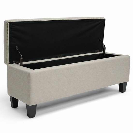 采用米色仿亚麻混纺布艺面料,超强耐用,镶嵌一圈仿古黄铜柳钉,优雅大方,黑色织物衬里,坐垫打开后可以储物,收纳空间巨大,适合放于客厅、门厅或卧室。尺寸为118.7 x 38.4 x 47厘米。