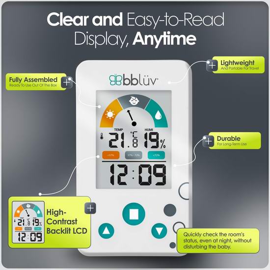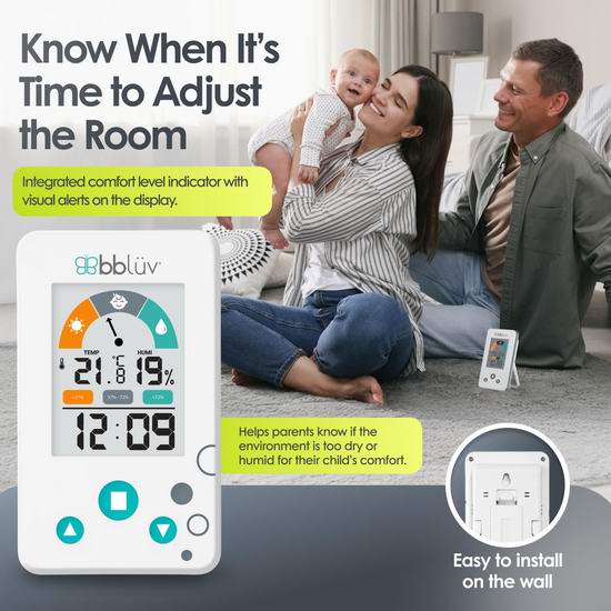 这款温度湿度计可在30秒内快速精准地读取环境温度,确保提供舒适的环境。湿度计和视觉警报功能可让您一目了然地提醒您调整房间环境,无需持续监测即可轻松维持最佳环境。可以挂在墙上,也可以使用折叠支架放置在平面上。提供两种模式(摄氏度和华氏度)以及 12 小时制和 24 小时制时钟格式,功能多样且易于使用。