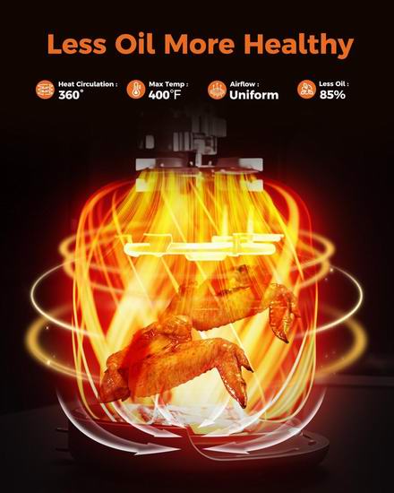 2.1夸脱容量,可制作1-2 人的食材,配备双旋钮,可轻松设定时间和温度,让食物保持酥脆。温度范围:75-204°C,烹饪时间:0-60 分钟,让您轻松烹制香脆可口的美食。通过快速空气循环,360° 气流使食物酥脆,用油量减少 85%,烹饪速度比传统烤箱煎炸快 30%。减少用油量,享受更健康的膳食,享受酥脆食物。
