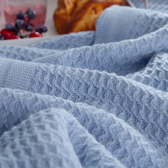 采用100%纯棉制成,轻薄柔软,精美华夫格编织设计,透气性好,有助于调节温度并带走湿气,外形尺寸为104x90英寸。