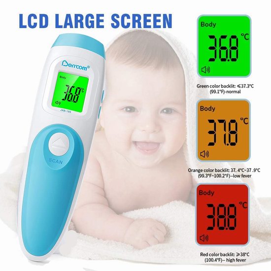 采用红外温度计,可快速准确的测量成人儿童前额、耳温、物体和环境的温度,带3彩色背光LED显示屏,发烧时将出现红色背光(正常绿色、橙色表示轻度发烧,红色表示高热),自动储存最近32组数据。