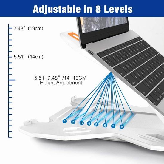 此款支架采用轻型实心塑料材质,经久耐用,便于携带,可快速打开和折叠,符合人体工学设计,调节笔记本电脑的观看角度,避免不当姿势造成的颈部手部疲劳和疼痛,并有助于笔记本散热。可用于放置15.6英寸以内的笔记本电脑和平板电脑,8级角度调节,配备手机支架。