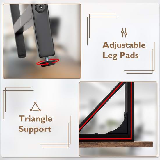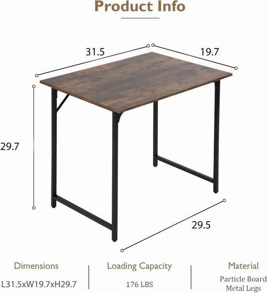 电脑桌采用加固金属框架,可调节桌腿垫提供了坚固稳定的基础,宽敞的桌面足够容纳笔记本电脑,外形尺寸为50深 x 80宽 x 75.5高厘米。