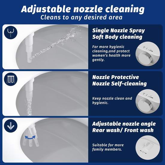 这款便洁宝功能强大,免用卫生纸,彻底改变人们千百年来如厕用纸擦拭的陋习,避免了擦拭不干净的尴尬,臀部变得清爽干净。喷嘴可根据个人需求自由调节充气位置,还可调整喷水压力,扩大清洗范围,促进血液循环,不用时卫生喷嘴会自动回缩。每次旋钮缩回时,喷嘴都会自动喷水清洁。