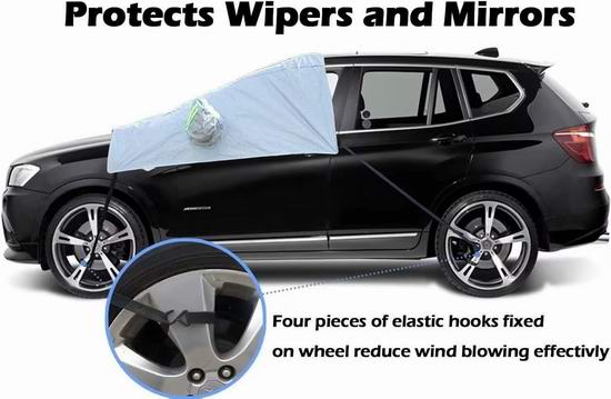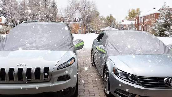 配备四个弹性挂钩设计,可固定在车轮上,减少风吹影响;中部松紧带可塞入车门并通过弹性扣锁定,有效防止被盗,同时牢牢固定雪罩位置,进一步增强安全性。后视镜盖上还设计有荧光绿色反光警示条,在夜间能发出强光,提供额外的安全提醒,避免意外碰撞。