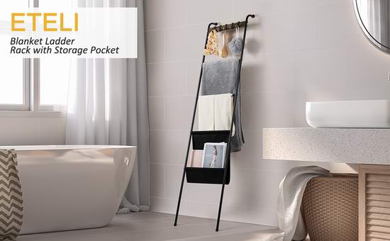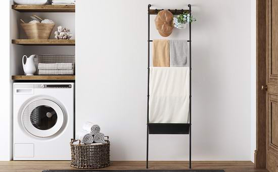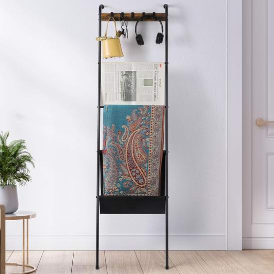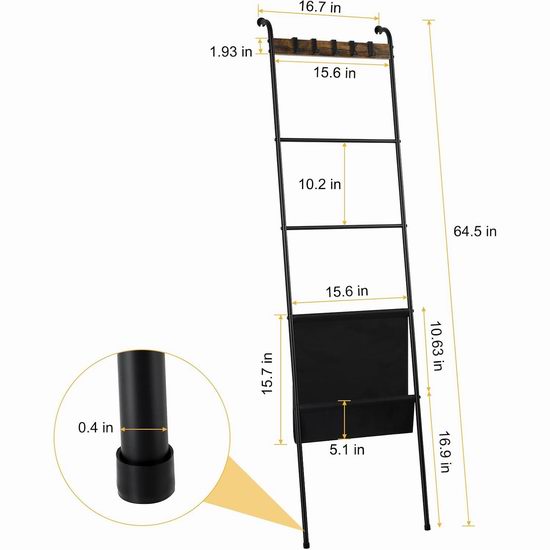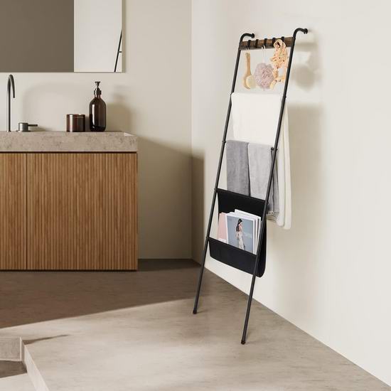 这款收纳架采用哑光黑铁和复古棕色中密度纤维板制成,梯形设计,配有5个可拆卸挂钩、4根挂杆和1个黑色牛津布袋,可用于收纳毛巾、浴巾、围巾、毯子和报纸等。尺寸为16.7 x 64.5英寸。