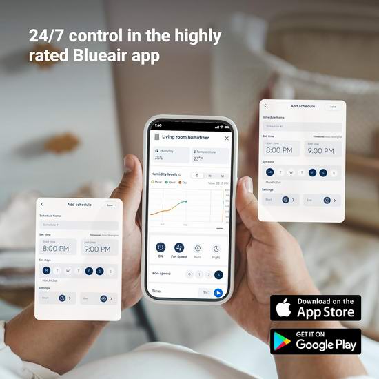 这款无雾智能加湿器采用 InvisibleMist 隐形雾化技术,提供干净、均衡的湿润空气,杜绝水渍和白色灰尘的困扰,营造清新舒适的睡眠氛围。顶部注水设计使加水操作简单方便,无需繁琐拆卸。加湿器配备 6 个月长效灯芯滤器、紫外线集成水泵以及洗碗机安全的水箱,大幅减少清洁频率和维护工作,让日常使用更加轻松。通过 Blueair 应用程序,您可以实时监控室内湿度,调整至理想水平。加湿器的 AutoHydrate 模式可自动调节湿度,为您打造完美的居家环境。自动干燥模式、直观的触摸屏以及应用程序和语音控制功能,为您提供个性化的智能体验。紫外线水泵进一步提升清洁效果,循环水流以确保空气加湿的洁净安全。
