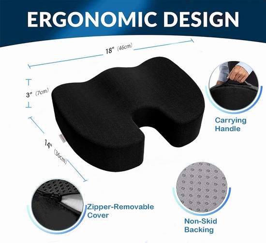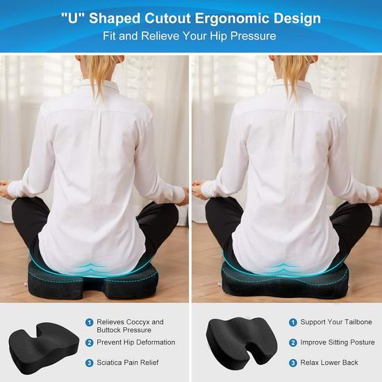 采用符合人体工程学的“U”形设计,内置快速回弹记忆海绵,旨在减轻下背部、腰部、臀部、腿部的压力,支撑尾骨并缓解压力,帮助您保持良好的坐姿和脊柱的自然曲线,缓解妊娠疼痛,促进血液循环,尤其适合长期久坐人士。