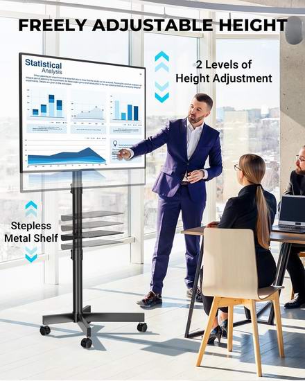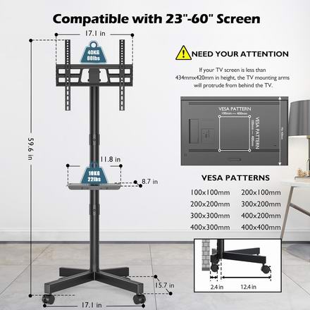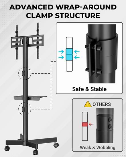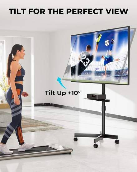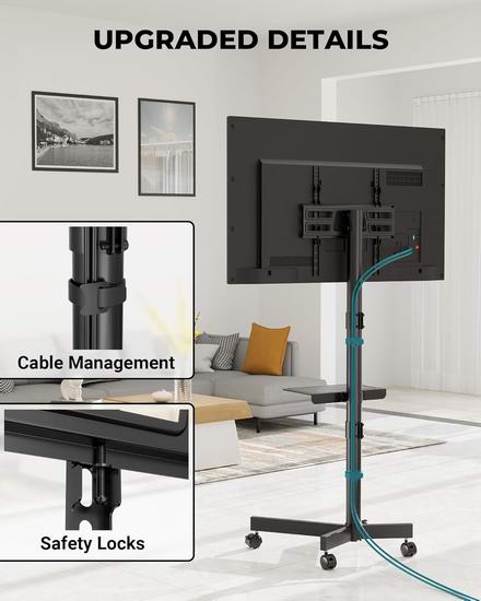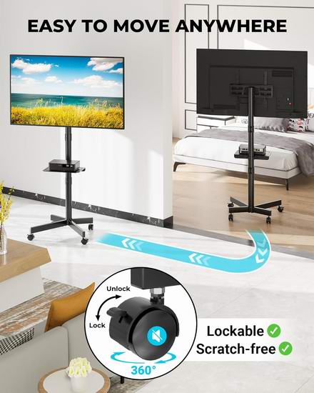 这款可移动电视支架适用于大多数 23-60 英寸的电视,VESA 安装孔距最大可达 400x400 毫米,最大承重88磅(40公斤)。支架支持高达 10 度的可调节倾斜角度,通过减少屏幕眩光和提高可视性,提升观看舒适度。配备四个重型360度旋转脚轮,可轻松从一个房间移动到另一个房间,锁定系统确保移动电视柜稳固就位。配备可调节搁板,提供两档高度调节,可放置笔记本电脑、游戏机或DVD播放器。集成式线缆管理系统,可将电线和电缆整齐有序地隐藏起来。