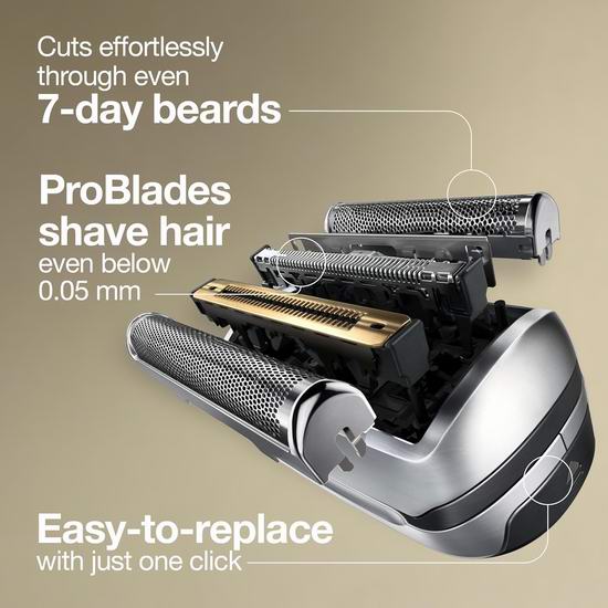这款博朗9系专业刀头能捕捉到更多胡须,带来格外温和的剃须体验。刀头搭配独特的 ProBlade 刀片,可剃除 0.05 毫米以下的毛发,带来持久贴合、温和舒适的剃须体验。只需轻轻一按即可轻松安装新的剃须刀头。100%德国制造,兼容博朗9系专业剃须刀和9系剃须刀。为了保持最佳剃须效果,建议每18个月更换一次9系专业刀头。
