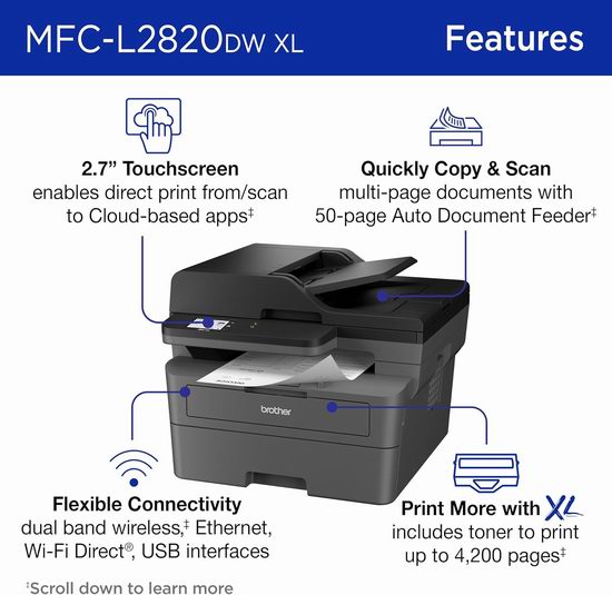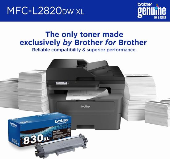 Brother MFC-L2820DWXL 商用单色激光打印机集打印、复印和扫描功能于一体,自带4,200页打印墨粉,支持免费云应用,并提供Refresh EZ Print订阅服务,让碳粉和墨水以更低成本送货上门。这款打印机具备先进的安全功能、移动打印、无线、以太网或USB连接,以及灵活的纸张处理能力,每月可打印高达2,500页。机器小巧耐用,性价比高,能够以经济实惠的价格输出清晰的黑白打印件。无需IT支持,内置双频无线(2.4GHz/5GHz)、以太网或USB接口,轻松连接多台设备。Refresh EZ Print订阅服务可帮助您节省高达50%的Brother原装碳粉费用,再也不用担心碳粉不足。Brother Mobile Connect应用可随时随地远程管理打印机,打印文件,订购耗材,跟踪碳粉使用情况。250页容量纸盘和50页自动进纸器使高效打印、复印、扫描、传真多页文件变得轻松自如,手动进纸槽则适用于信封和特殊纸张的处理。