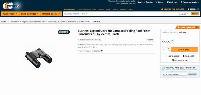 史低价!Bushnell 博士能 传奇 10×25 高清双筒望远镜 148.16加元,newegg同款价 559.98加元