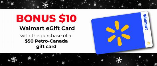 Walmart店内活动,1月15日-21日期间,在Walmart网店或店内购买价值50加元Petro-Canada加油礼品卡,送价值10加元Walmart电子礼品卡;