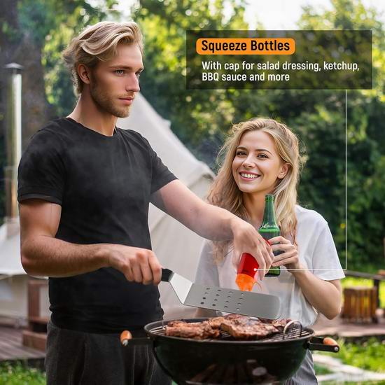 这款户外烤盘工具套装采用优质不锈钢材质,具有卓越的耐热性、坚固性和耐用性,不易弯曲或断裂,套件包含18件工具,包括铲子、切碎器、锅盖、蛋圈、挤压瓶等,配有周到的配件,如围裙、手套和储物袋,适用于户外烧烤、露营、房车旅行、海滩派对等多种场景。