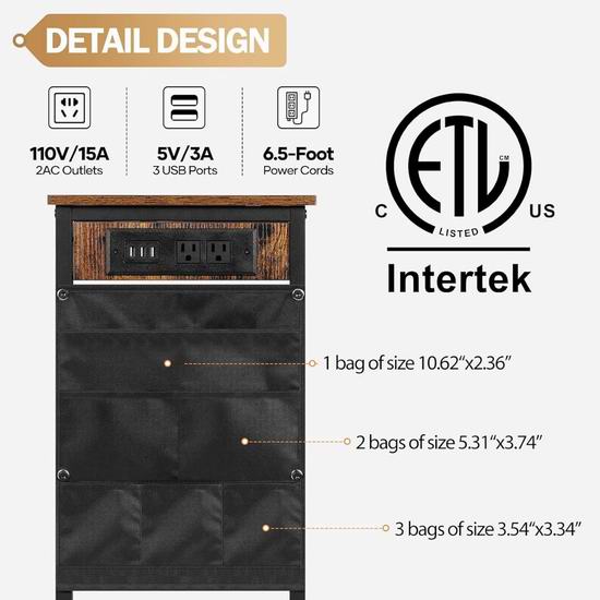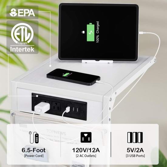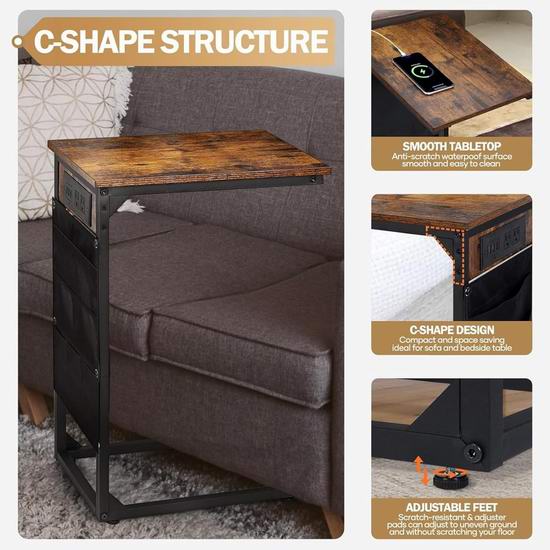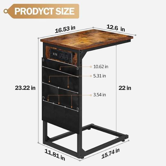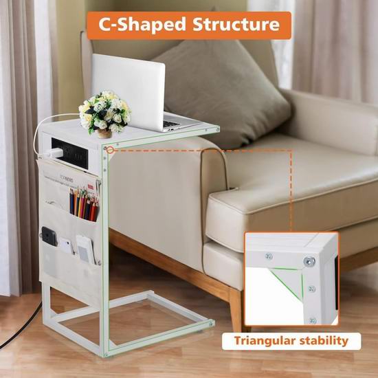 采用钢架结构,表面采用精致的黑色涂漆处理,坚固耐用。内置充电站,配有2个交流电插座和3个USB 5V/3A充电口,方便为手机、平板、台灯和笔记本电脑等设备供电,电源线长达6.5英尺。C形结构,背面设有收纳袋,可轻松将滑入沙发、沙发或床,方便工作、阅读,方便拿取零食、咖啡、手机和书籍,方便休息时使用。可用作客厅或卧室的边桌、沙发桌、电脑桌、小吃桌或床头柜。外形尺寸为15.74长 x 11.81宽 x 23.62高 英寸。