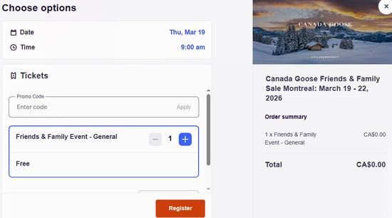 Canada Goose官方活动,在活动页面成功登记个人信息,即可通过email获取电子门票,凭门票在指定的日期和时间前往活动现场购买,点击进入购票页面。