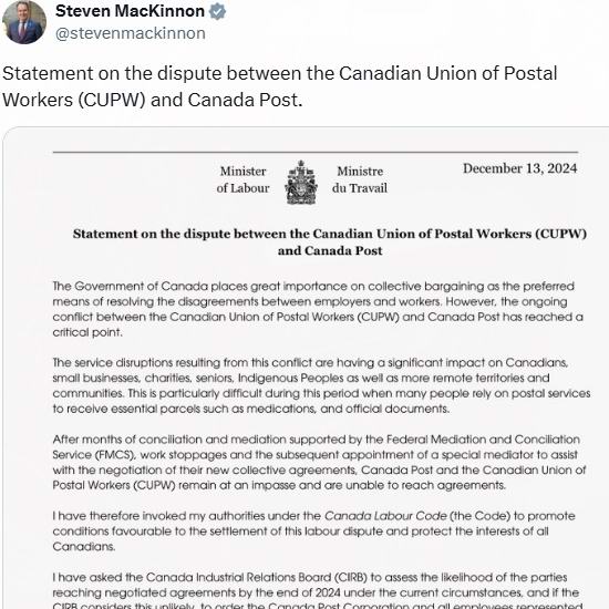 12月13日,全国范围内的加拿大邮政罢工已持续将近一个月,联邦政府决定采取行动终止这场劳资僵局。加拿大联邦劳工部长史蒂文·麦金农(Steven MacKinnon)于周五上午召开新闻发布会,宣布将动用《加拿大劳工法》赋予的权力解决此次罢工问题。