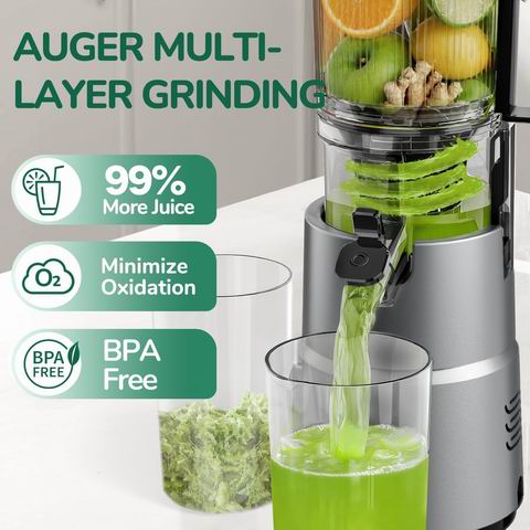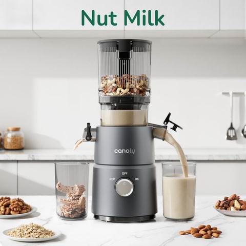 Canoly C03 冷压榨汁机主打“大口径省事+细腻口感+好清洗”:4.5 英寸宽进料口支持整颗蔬果直接放入,配合自动旋转切割与 60 盎司进料容量,一次能处理更多食材;200W 交流电机搭配升级多层研磨螺旋钻,以慢速冷压方式提升出汁率、减少浪费并降低氧化;0.1mm 超细孔的无 BPA 滤网更不易堵塞,过滤更细让果汁更顺滑,同时配二合一滤网可切换果汁/坚果奶;机身紧凑省空间,哑光灰外观,且仅 4 个可拆卸部件,5 秒快装,快拆锁扣+自清洁滤网设计让冲洗更省力,并附清洁刷便于彻底清洁。