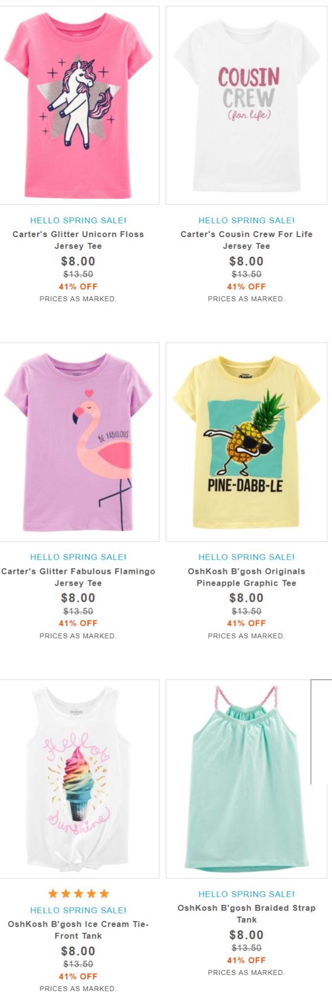 Carter's OshKosh网店销售,Carter's OshKosh儿童新款春季T恤 8加元特卖,满50加元包邮,点击进入订购页面。