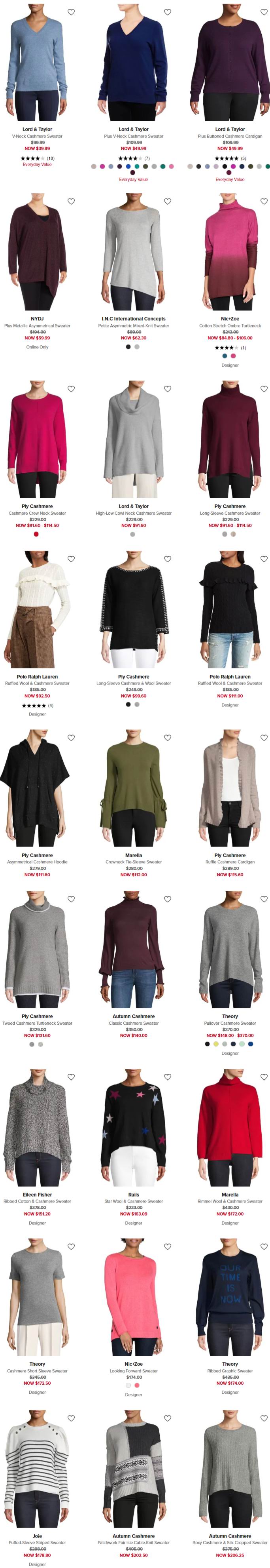 The Bay网店销售,精选 Lord & Taylor 等品牌女式100%纯羊绒毛衣3折起清仓,使用折扣码:VIP 额外7.5折,满99加元包邮。点击进入订购页面。