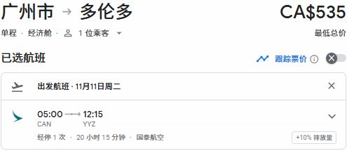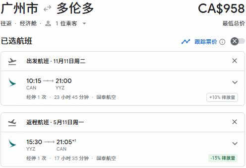 香港国泰航空双11大促,现在订购2025年内从广州出发,经香港中转,前往多伦多单程、半年内往返机票享受惊喜特价优惠;