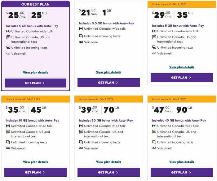 35GB流量(需选择自动付费)+无限加美通话+无限短信,月费仅29加元;