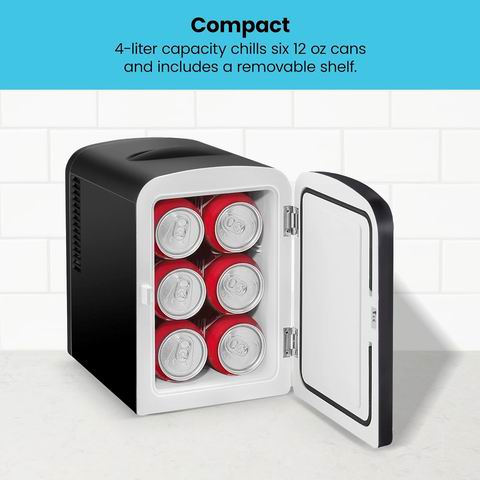 Chefman 迷你冰箱适合个人空间、旅行、办公室、宿舍等,设计小巧时尚,便于携带。可用于冷藏或保温零食、饮料、婴儿奶瓶、护肤品等。冷却至 44°F,保温至 140°F,容量为 4 升,可存放 6 个 12 盎司汽水罐。带可拆卸架子,环保无氟利昂,可用标准插座或 12 伏汽车充电器供电。cETL 认证,1 年保修,确保安全耐用。